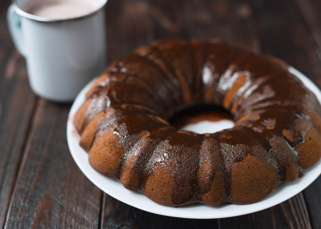 Bake in the center of the oven for 45-50 minutes until a cake tester or wooden skewer inserted into the middle of the cake comes out clean. Allow to cool for 10 minutes and then carefully invert onto a cooling rack to cool completely. Prepare glaze.