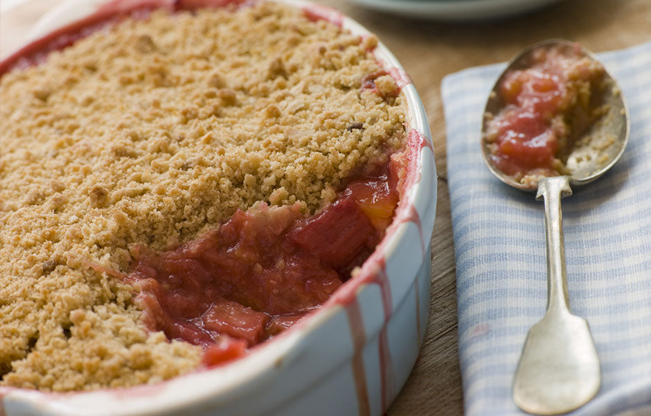 Bake crumble at 350 degrees for 30-40 minutes or until the rhubarb is tender.