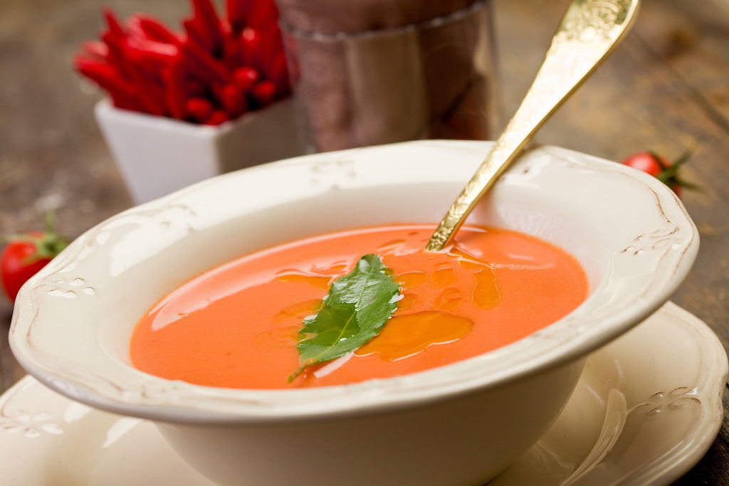 Ajoutez le bouillon, les poivrons grillés, la purée de tomates, les feuilles de basilic et l'origan dans la casserole. Baissez le feu à moyen et laissez mijoter 20 minutes. Retirez la casserole du feu. À l'aide d'un mixeur plongeant, mixez la soupe chaude jusqu'à obtenir une consistance lisse et onctueuse. Ajoutez la crème fraîche épaisse et le fromage romano. Mélangez. Rectifiez l'assaisonnement avec du sel et du poivre. Servez la soupe dans des bols individuels, arrosée d'environ une cuillère à café d'huile d'olive aux herbes toscanes Della Terra et décorée d'un brin de basilic.